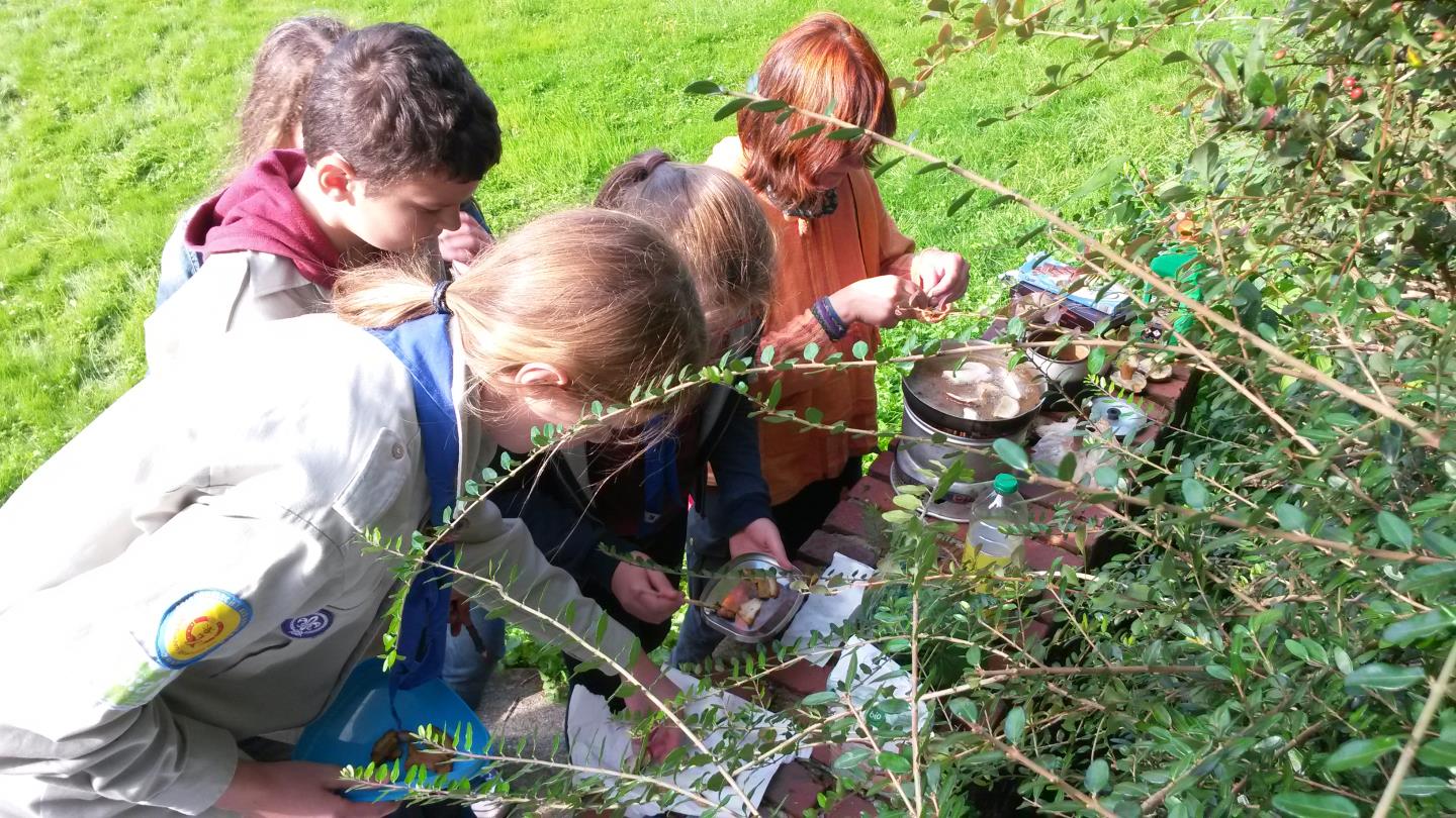 Als jeder, der Lust hatte, einmal dran gewesen war, ging es ab in den Wald. Dort spielten wir an verschiedenen Orten viele schöne Spiele – zum Beispiel eine australische Schatzsuche. Hier spielten die Mädchen gegen die Jungs. Wir versteckten für das andere Team einen Schatz und mussten den Weg dorthin möglichst fantasievoll beschreiben. Die Mädchen fanden den Schatz zuerst, aber mit etwas Hilfe gelang es schließlich auch den Jungs! Als wir wieder an der Kirche ankamen, gab es Würstchen und Stockbrot. Außerdem frittierte uns Aggi ein „Unkraut“ namens Giersch und Pilze, die wir zuvor im Wald gesammelt hatten. Das schmeckte uns allen sehr gut. Gegen 17 Uhr nahm dieser schöne Tag sein Ende. Uns hat es sehr gut gefallen.