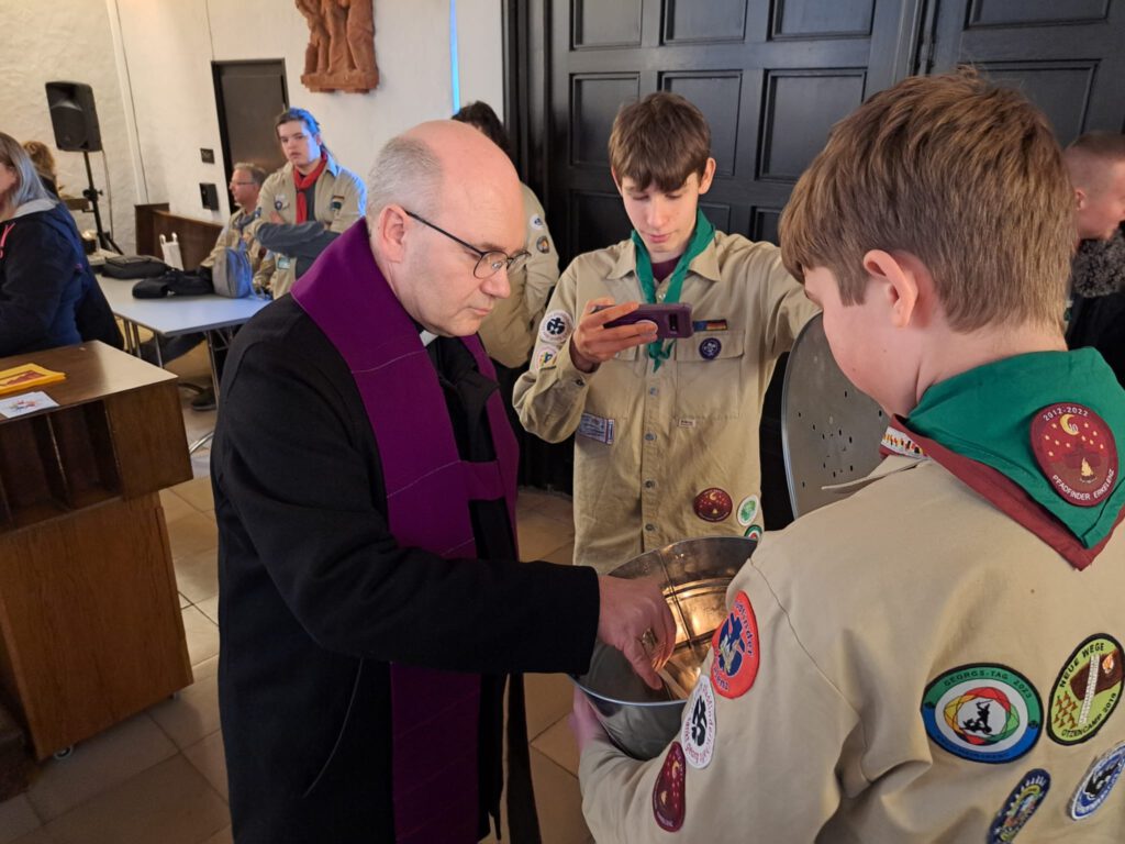 Nach einer kurzen Zwischenstation auf dem örtlichen Weihnachtsmarkt begaben sich alle zur Kirche Heilig Geist, wo das Friedenslicht in einem schön gestalteten Aussendungsgottesdienst abgeholt wurde. Dort trafen die Juffis und Pfadis dann auch auf die Rover und bildeten gemeinsam mit den Leiterinnen und Leitern eine Gruppe von fast 50 Personen. Das Friedenslicht wurde von Bischof Dr. Helmut Dieser persönlich entzündet, bevor die Gruppe erneut den Weihnachtsmarkt besuchte und dann die Rückreise antrat.
