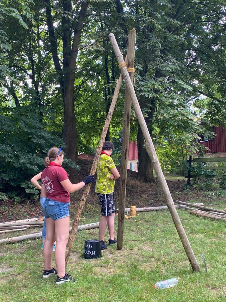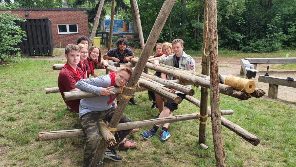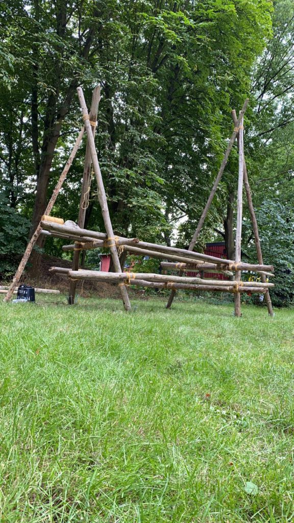 Als wir dann morgens vom hellen Licht geweckt wurden und das Frühstück hinter uns hatten, begannen wir uns Gedanken darüber zu machen, wie wir in Zukunft die Wölflinge leiten würden. In Zweierteams planten wir jeweils eine volle Truppstunde. Während die Teams nacheinander ihre Truppstunden vorstellten übernahmen die anderen die Rolle der Wölflinge. Die erste Gruppe hatte das Chaosspiel vorbereitet, die zweite Gruppe machte etwas mit Knoten und die dritte Gruppe ein Rätsel. Am Ende des Tages stellte Stephan uns noch vor die Herausforderung, eine Art Picknicktisch aus Holzbalken und Sisal-Schnur zu bauen. Mit vereinten Kräften haben wir auch das geschafft!