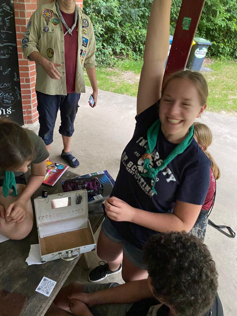 Nach dem Abendessen sollten wir dann unsere Rovertücher bekommen. Leider waren diese im letzten Jahr mit einem Fluch belegt worden, den wir zunächst brechen mussten. Dafür mussten wir als Team ein viele Schlösser öffnen, Codes knacken und weitere Rätsel lösen. Letztendlich haben wir den Fluch besiegt und unsere neuen Rovertücher bekommen. Abends saßen wir noch zusammen und spielten Karten. Leider dürften wir wegen der Trockenheit kein Feuer machen.