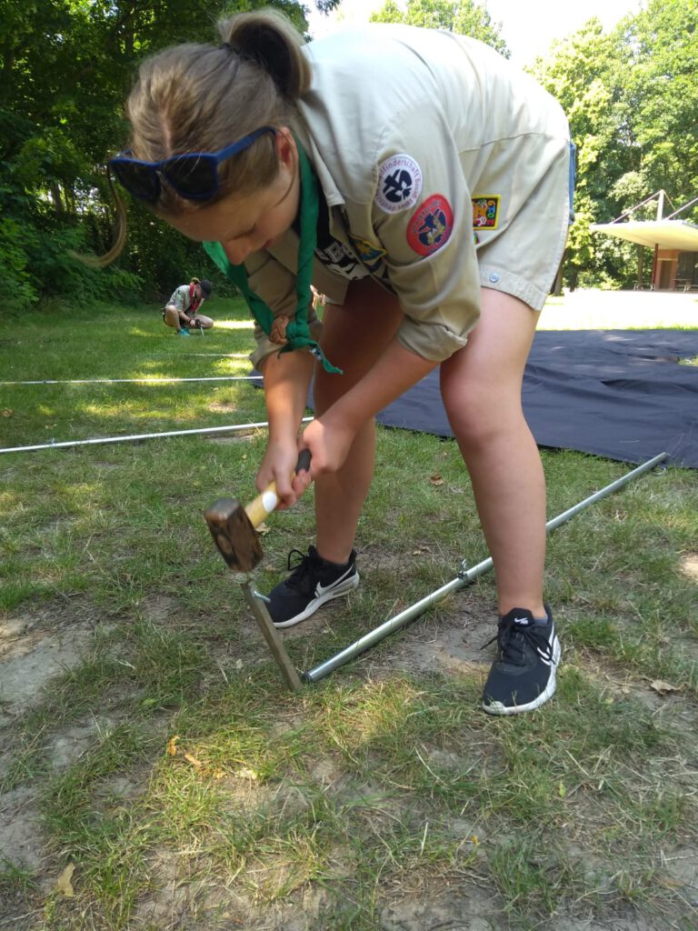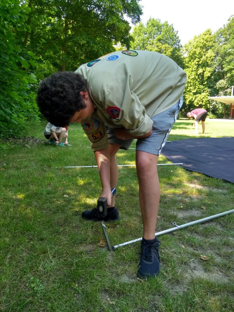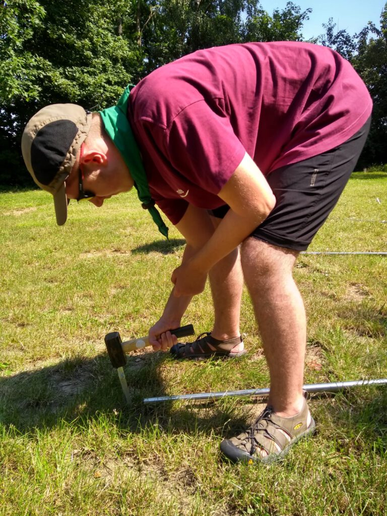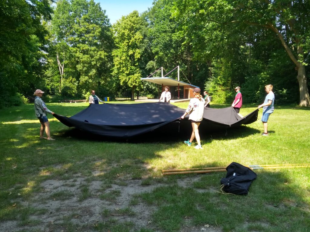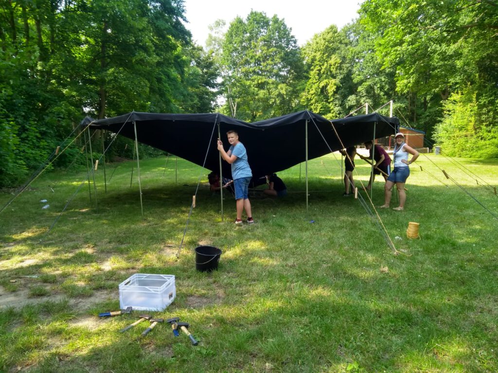 Die ersten Schritte waren noch relativ einfach und schnell erledigt. Als es dann darum ging das Dach der Jurte nach oben zu bekommen, wurde es etwas schwerer. Ganz zu schweigen davon, dass das Regendach auch noch nicht befestigt war. Leider wusste nicht mal Sandra genau, wie man das machen sollte. So erfinderisch wie wir als Pfadfinder nun mal sind, war unser erster Schritt, das Internet zu befragen. Doch anscheinend hatte gefühlt niemand im ganzen World Wide Web eine Ahnung wie man das genau macht. Nach ganzen drei Stunden Experimentieren schafften wir es dann doch im dritten oder vierten Anlauf, das Dach hochzubekommen. Es war zwar sehr wahrscheinlich falsch, aber es hielt und niemand hatte mehr den Nerv alles noch mal zu machen. Das Aufbauen des weiteren Felix Zeltes war schnell gemacht. Genauso wie das Zuknöpfen der Jurte.