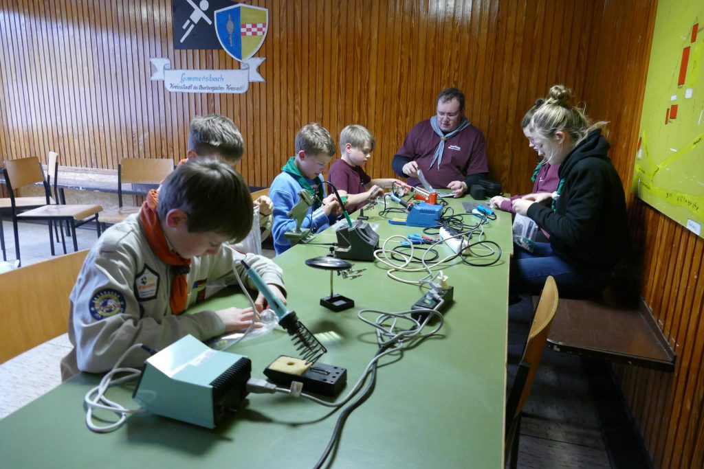 Nachmittags standen dann die unterschiedlichsten Workshops auf dem Programm. Vom Löten von elektronischen Schaltungen, über das Bearbeiten von Speckstein und dem Basteln von Nagelbildern, bis hin zum Staudammbau und Streunen durch den anliegenden Wald war für alle Geschmäcker gesorgt. Eine Gruppe unterstützte auch das mitgereiste Küchenteam bei der Vorbereitung des Abendessens, welches nach der vielen Bewegung und Aktivitäten an der frischen Luft für eine reichhaltige Mahlzeit sorgte.